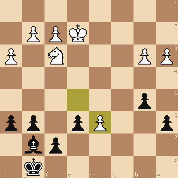 dファイルのパスポーンが怖いですが、キングが間に合うので大丈夫。ビショップの位置が良く、相手のナイトの位置が悪いので、真っすぐdポーンを回収することができれば勝てそうです。本譜では、39…Kf8 40.Ke3 Ke8 41.Ke4 f5+! 42.Kf4 g5+!でdポーンを守り切れません。あとは手堅く指して勝ち。